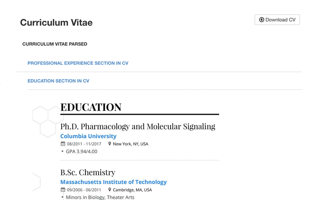 Detailed view of specific CV sections and automatic import of candidate profile picture