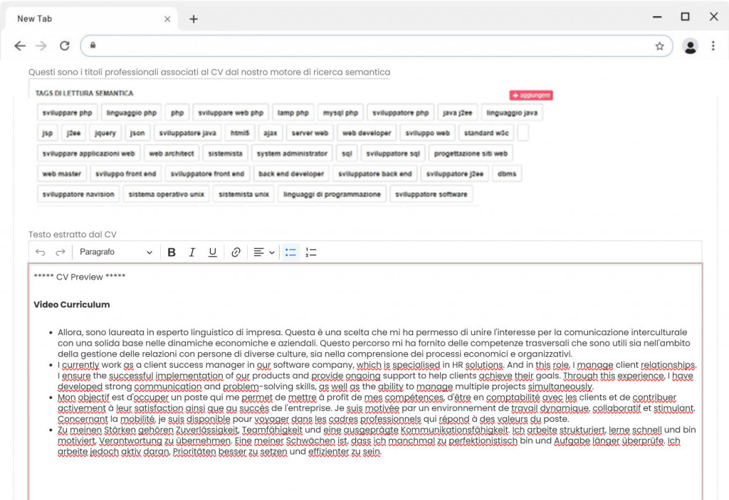 • Le moteur sémantique analyse ensuite le contenu, en extrait les compétences pertinentes, les soft skills et les mots-clés, et les rend disponibles pour vos recherches.