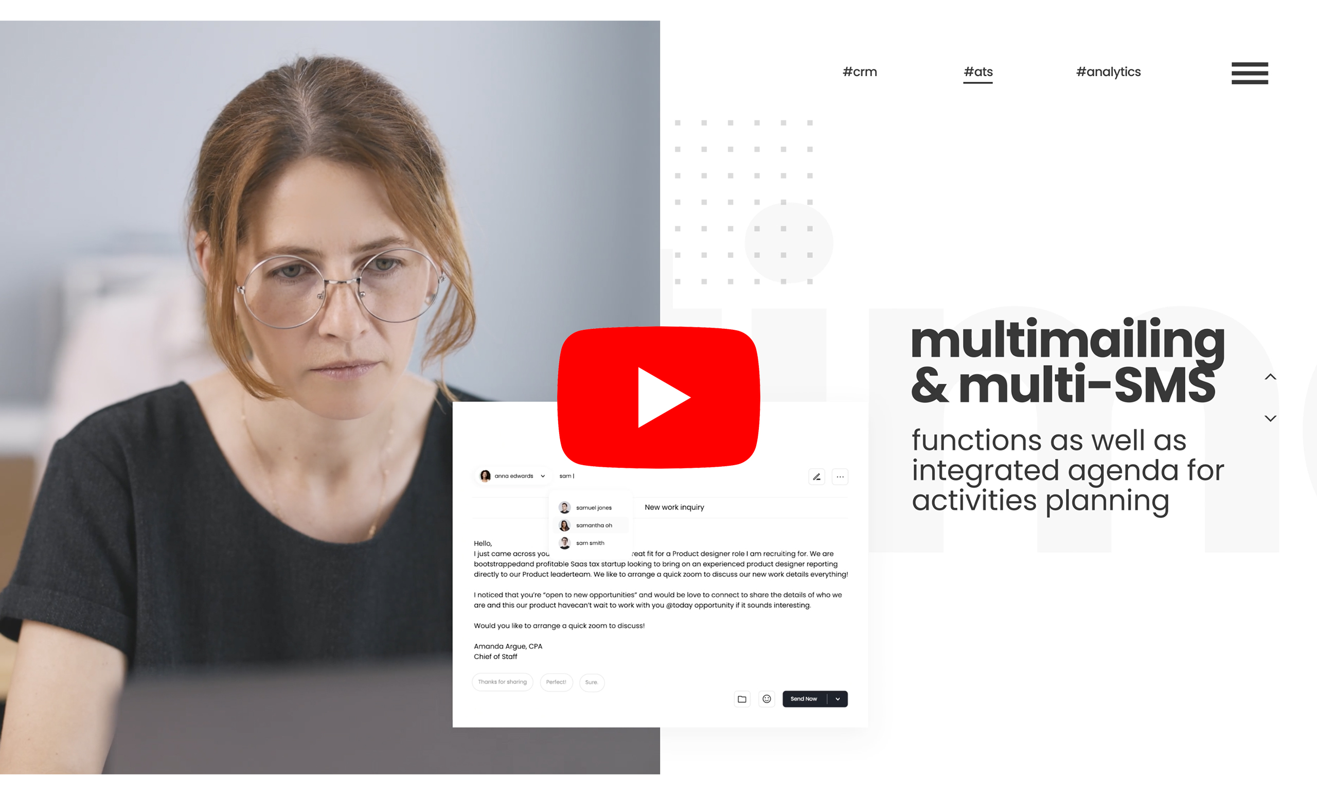 Pré-triagem automática com Inteligência Artificial, multipostagem bidirecional, requisição de pessoal, envio de perfis e shortlists, envio de e-mails em massa para candidatos e clientes, KPIs e relatórios de seleção e comerciais.